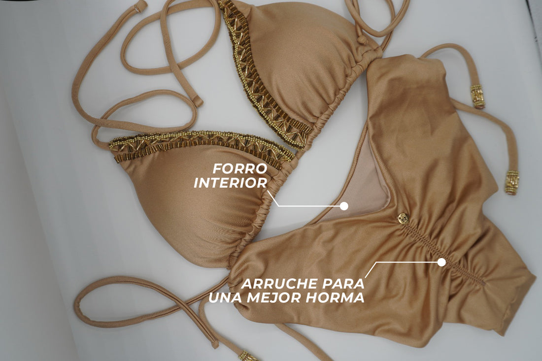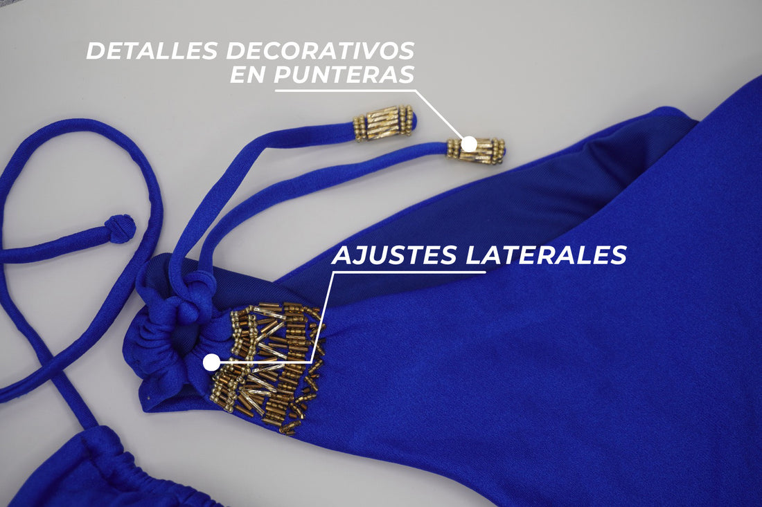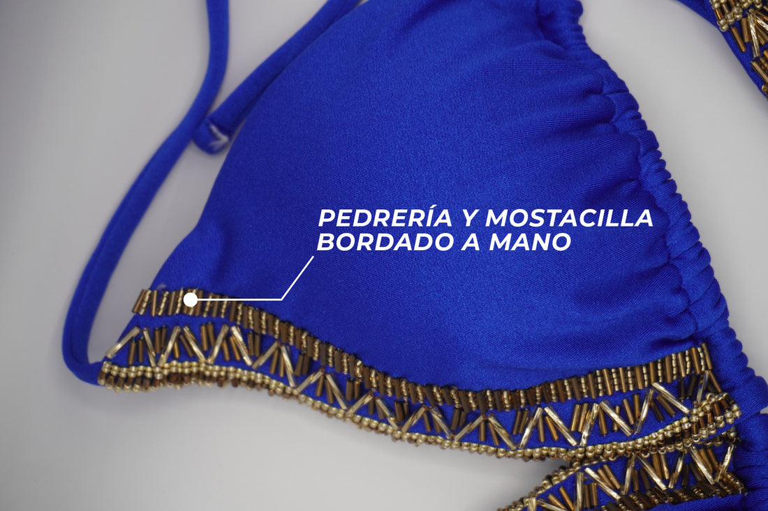 Bikini infaltable en tus paseos. Copa triangular interna removible, bordado a mano y esmaltado para asegurar que la mostacilla- pedrería tenga larga durabilidad. Panty con ajustes en laterales detalles de bordado y punteras en las tirantas.