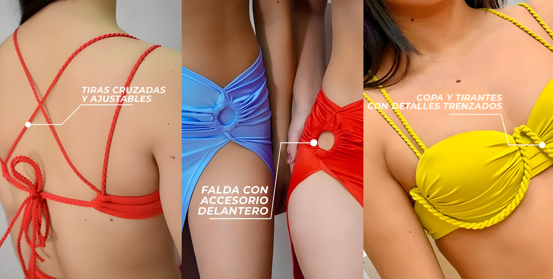 Estamos encantadas con este set. Es el outfit perfecto para tus vacaciones. Copa con varilla fija interna con decoración tipo trenza. Panty fijo tipo tanga, sin ajustes en laterales. Incluye falda con argolla delantera. La puedes usar con abertura de lado o de frente.